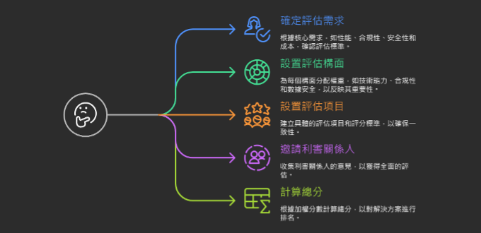 具體步驟包括:首先,確認核心需求,如交易量、合規要求或部署時程。其次,設定構面權重,例如技術能力30%、合規性20%、數據安全25%、服務支援15%、成本效益10%。再者,依據各構面設置細項評分,邀請關鍵利害關係人填寫評估表,計算加權總分並排序。最後,建議在決定前可進行小規模試運行或POC測試,收集用戶回饋與操作評價,並持續依技術演進更新評估指標。