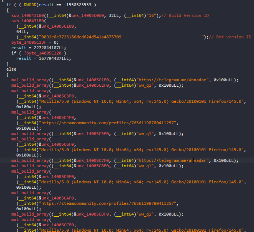 Vidar 2.0一開始會先執行一個完整的初始化階段,此階段會建立多執行緒架構,並透過複雜的狀態機器來混淆程式的控制流程。接著,惡意程式會執行大量的反制分析檢查,包括除錯器偵測、時序驗證、系統運作時間檢查以及硬體分析,確保惡意程式只在真正的受害系統(而非分析環境)當中才會執行。這些檢查必須全部通過,程式才會繼續執行,只要有任何一項檢查沒通過,程式就會立即終止,這是為了躲避沙盒模擬分析環境的偵測。