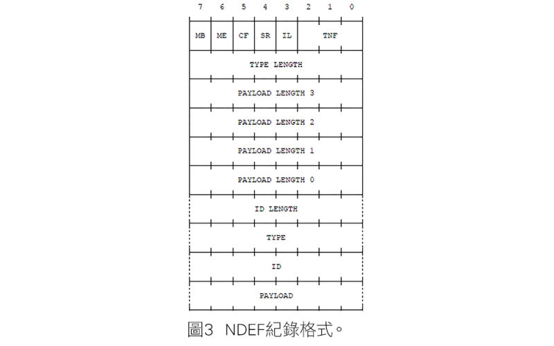 NDEF記錄的格式如圖2所示,分為表頭(Header)和數據載荷(Payload)兩大部分,其中包含實際的應用程序之特定數據,由NFC論壇以記錄類型定義(Record Type Definitions,RTD)形式發布的實際應用特定數據類型來格式化。