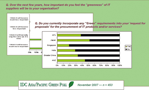 但不管如何,綠色IT並非一朝一夕可成。看看IDC的一項問卷調查:「現階段在採購IT設備或服務時,是否將任何綠色的要求列入考量?」亞太各國在綠色IT意識的進展上快慢不一,日本、紐澳的接受度最高,而新加坡看來還有一大段路要走。