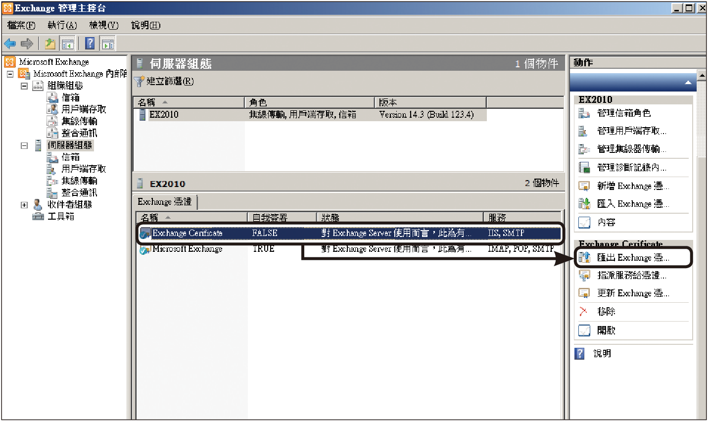 那該怎麼做呢?先開啟Exchange Server 2010的管理主控台,然後如圖6所示在「伺服器組態」節點頁面中,針對所要匯出的Exchange憑證,點選「動作」窗格內的「匯出Exchange憑證」連結。