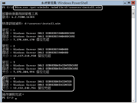 首先,如圖47所示下達命令「Dism /get-wiminfo /wimfile:D:\Sources\install.wim」來讀取安裝光碟中的install.wim映像檔資訊,可以發現四個索引的安裝程式,接下來要使用的是索引4的DataCenter完整版本。