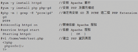 下列操作使用YUM套件管理工具進行安裝Apache、PHP等相關套件的動作。可以在安裝套件完成後,使用「php -m」指令來查看PHP擴充模組(PHP Extension)是否正確載入。