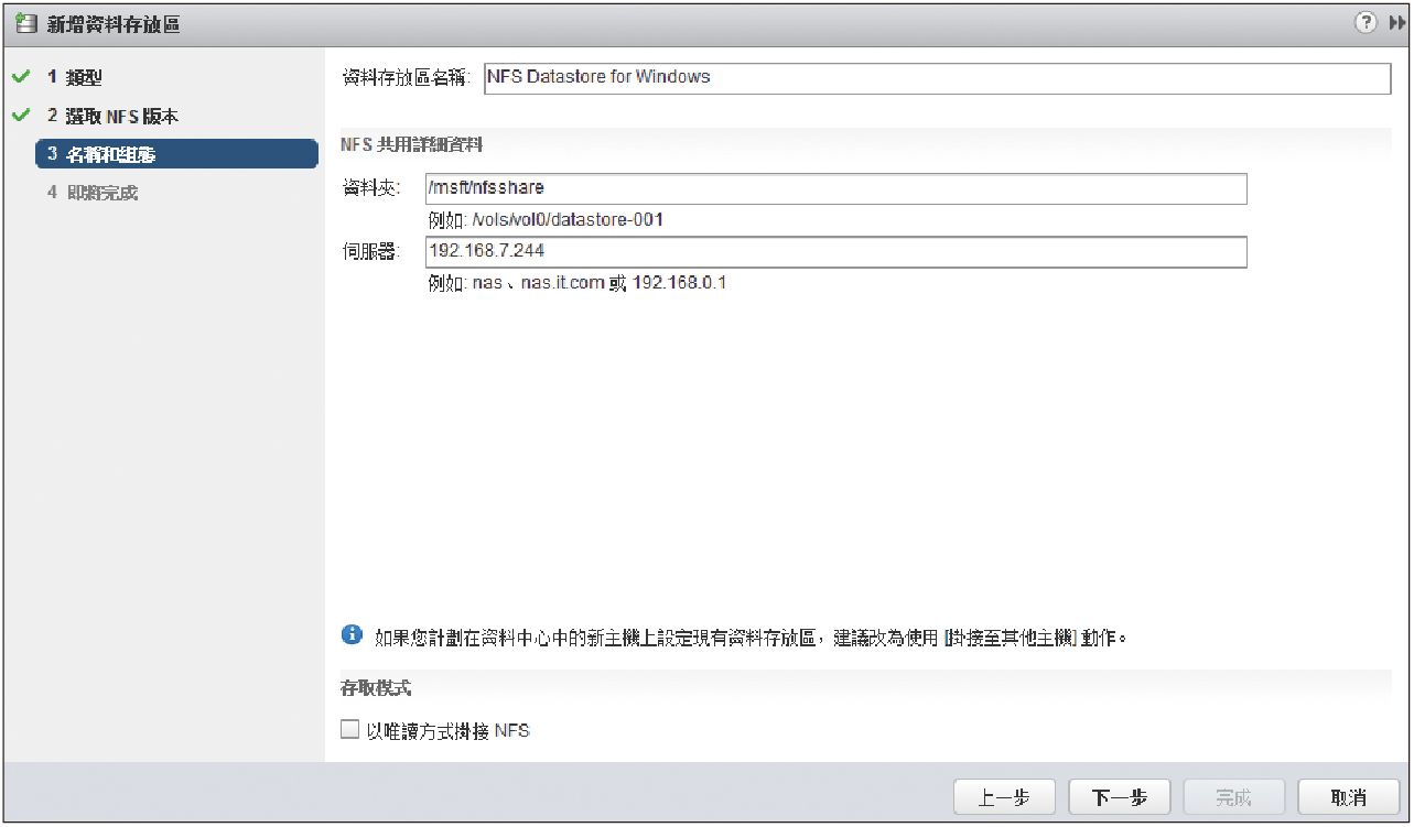 如圖18所示,在「名稱和組態」頁面中,先輸入一個新的資料存放區名稱,然後再鍵入NFS的網路共用路徑,例如「/msft/nfsshare」。此外,還要輸入伺服器IP位址或FQDN。值得注意的是,也可以選擇是否要以唯讀的方式掛接NFS。