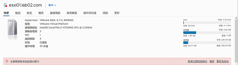 凡是結合金鑰管理伺服器所進行的任何加密保護,KMS主機都必須在啟動狀態下,並且與vCenter Server保持連線,否則受保護的虛擬機器所在ESXi主機,將會在「摘要」頁面中出現如圖18所示的「主機需要啟用加密模式警示」訊息。而當進一步點選「啟用主機加密模式」超連結時,也會在確認執行啟用後跳出「發生一般執行階段錯誤」訊息。