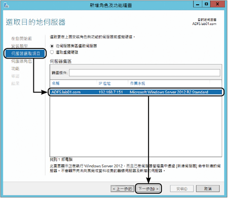 在「伺服器管理員」介面中,點選開啟「新增角色及功能」連結。來到如圖9所示的「選取目的地伺服器」頁面後,確認已選擇AD FS伺服器,然後按一下〔下一步〕按鈕。