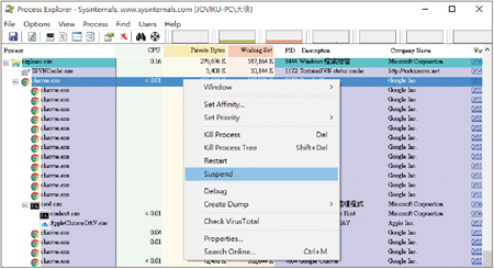其中暫停執行中的程序功能(Suspend)、重新啟動執行程序,以及從線上檢視該執行程序是否可能為病毒等等,皆是相當實用的管理功能。至於設定程序的優先順序或親和性,同樣可以在此完成設定。