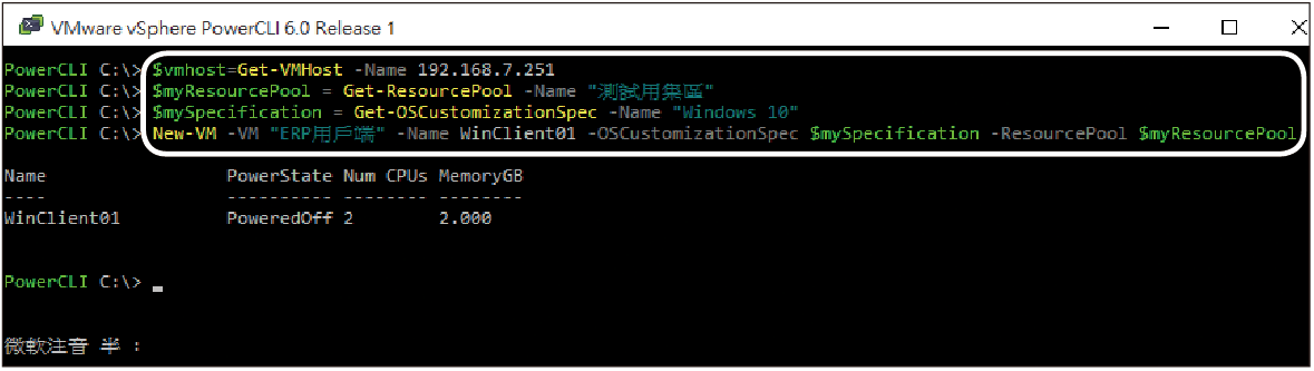 大量複製的作法很簡單,只要如圖13所示一樣,依序執行以下的命令參數來完成資源集區(選用)以及客體作業系統規格的變數設定,就可以接著使用New-VM命令參數來完成新虛擬機器名稱以及自訂規格、資源集區變數的指定: