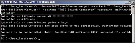 指定SharePoint Server 2010與FAST Search Server的SSL安全通訊設定是必要的步驟。如圖17所示,先複製預設位在「C:\FastSearch\installer\scripts\」路徑下的securefastsearchconnector.ps1手稿檔案以及預設在「C:\FastSearch\data\data_security\cert\」路徑下的FASTSearchCert.pfx憑證檔案到SharePoint Server 2010伺服器中。