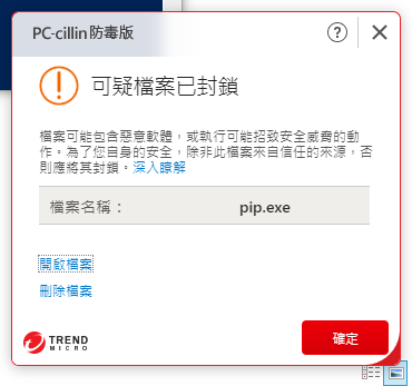 成功安裝Python後,使用系統管理員身分開啟命令視窗,接著執行「pip install dcli」命令參數,安裝dcli模組程式。值得注意的是,有一些防毒軟體(例如PC-cillin),如圖3所示可能會出現「可疑檔案已封鎖」警示訊息,此時只要稍等一下,即可點選「開啟檔案」超連結來完成安裝任務。另外,若是安裝在非Windows的平台且沒有root的寫入權限,可以嘗試改為執行「pip install --user dcli」命令進行安裝。