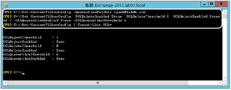 如果要查看目前各種SCL閾值的配置狀態,則使用「Get-ContentFilterConfig | Format-List SCL*」命令。