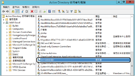 接著,就來一窺究竟SharePoint小組網站信箱在Active Directory中的長相。如圖48所示,這裡所選取的SM13093XIIX帳戶,就是在SharePoint小組網站中建立網站信箱應用程式時,系統所自動幫忙建立的網域帳戶,此信箱帳戶目前狀態處於停用,因為它僅提供作為信箱帳戶,而不需要使用它來登入網域。