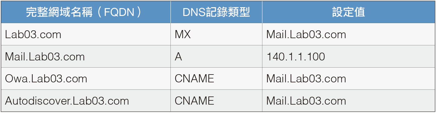 表1所示便是一個典型Exchange Server的DNS記錄設定範例,內外部的DNS伺服器必須都有相同的記錄設定,這包括網域的MX記錄、Exchange Server的A記錄、OWA的別名設定、自動探索(Autodiscover)的記錄設定,只是一組必須對應內部IP位址,另一組則要對應外部的IP位址。
