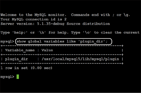 接下來,便可以執行「show global variables like 'plugin_dir';」指令,利用此指令來查詢外掛程式目錄的位置。