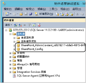 如圖22所示,在「資料庫」節點下可以看到一個名為「SharePoint_AdminContent」的資料庫,它便是SharePoint管理中心專屬使用的,而另一個「SharePoint_Config」資料庫則是用來儲存SharePoint的各項組態配置。