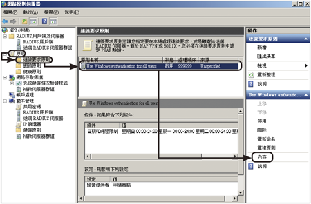 接下來,如圖10所示點選至「原則」→「連線要求原則」節點下,然後選取預設現有的原則項目,並點選「內容」繼續。