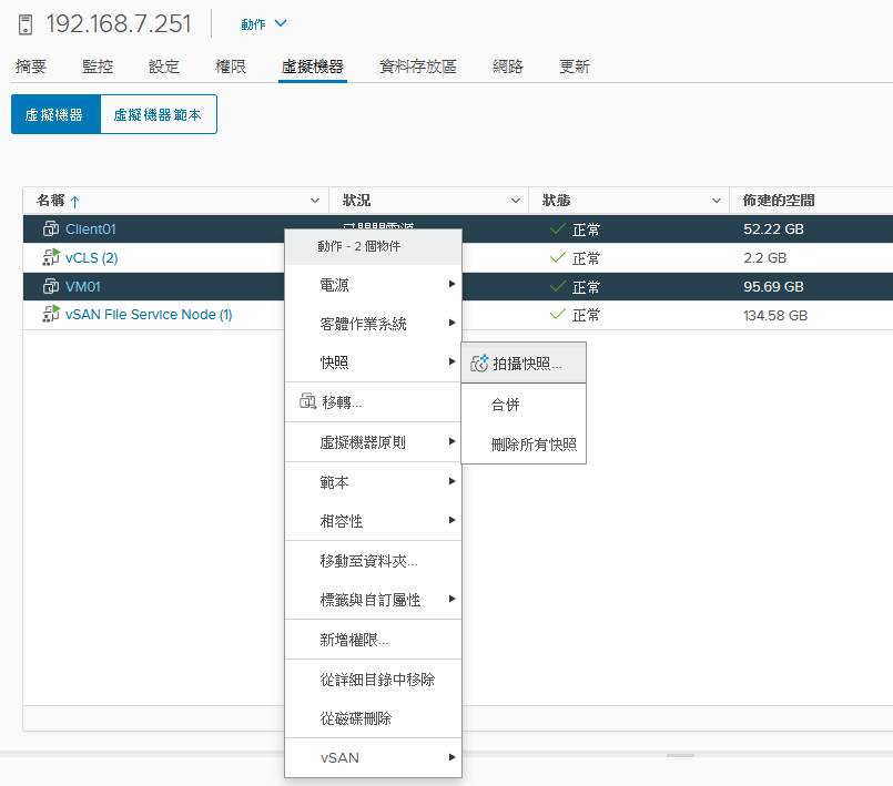 接下來,看看幾個關於虛擬機器的批次操作管理實例。首先點選至任一ESXi主機節點的「虛擬機器」頁面,接著透過〔Ctrl〕按鍵並搭配滑鼠的左鍵來完成虛擬機器的連續選取。然後按下滑鼠右鍵,如圖11所示,便可以在【快照】子選單中選擇執行拍攝快照、合併或是刪除所有快照的功能選項。在此以「拍攝快照」功能為例,執行後將會出現「對N個物件執行此動作?」的提示訊息,按下〔是〕後便會完成所有選定虛擬機器的快照任務。