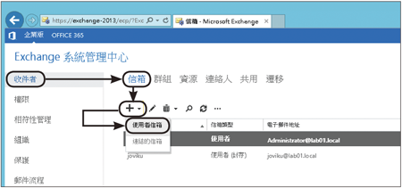 首先,如圖25所示切換至「收件者」項目頁面,然後點選至「信箱」子頁面內,最後點選新增圖示〔+〕下拉選單中的【使用者信箱】選項。