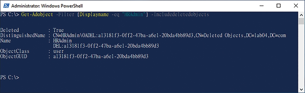 針對Active Directory已刪除物件的還原,一樣可以透過PowerShell命令來進行。如圖7所示,便是還原名為「HRAdmin」的帳號,並查詢是否已經成功還原: