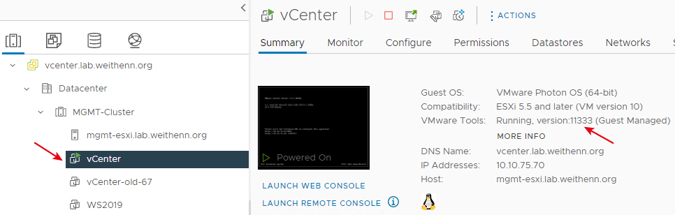 切換到vCenter Server管理介面中,可以看到新版的vCenter Server管理平台,除了沿用原有的FQDN「vcenter.lab.weithenn.org」和IP位址「10.10.75.70」之外,也同時升級VMware Tools版本,將原本舊版的「10309」升級為新版的「11333」,如圖11所示,並且舊版的vCenter Server已經自動關機,且升級過程中的暫用IP位址「10.10.75.50」也已經釋放。