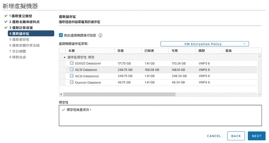 在「Select storage」頁面中,除了選擇虛擬機器的儲存區外,如果想要較好的執行效能,可使用預設的「Thick Provision」虛擬磁碟類型設定。相反地,如果只是測試用途,可改成「Thick Provision」設定以節省更多的儲存空間。確認出現「Compatibility checks succeeded」訊息後,便可以按下〔NEXT〕按鈕。