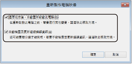 如圖17所示,此時將開啟「重新製作電腦映像」頁面,建議將這兩個選項都勾選起來,以便於能夠自動檢查目標磁碟的健康狀態,並且在完成系統映像檔回復後自動重新啟動電腦。