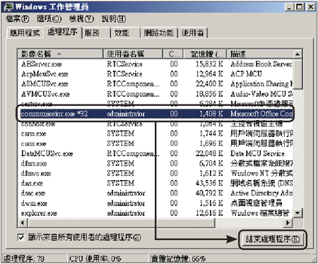 對於需要立即停止的程序,只要在選取之後按下〔結束處理程序〕按鈕,便可以強制中斷。