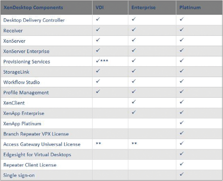 再來看看Citrix XenDesktop的授權版本。表2是Citrix XenDesktop的版本比較,讀者可以很容易地發現,其授權元件均包含XenServer以及相關套件,亦即在Citrix XenDesktop中其實也包含了伺服器虛擬化軟體。至於在授權計費模式方面,VMware View只有Concurrent User單一只計算同時連線數的授權模式,而Citrix XenDesktop則有三種終端數量計算方式可以選擇,包括Named User、Device以及Concurrent User。