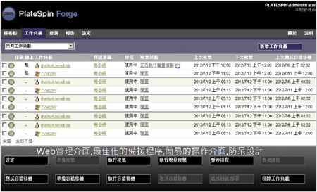 「另一項挑戰則來自於災難復原的過程。」他解釋,傳統災難復原的步驟相當繁瑣,往往一個不小心的操作失誤,就可能造成系統復原時間的延宕,甚至導致更大的災情,因此企業需要一個只需單鍵就能復原的自動化機制,並且具有防呆功能設計,以防止因為人為疏失而造成更大損失的解決方案。「Novell PlateSpin Forge是一款以虛擬技術為底層架構的整合式備援硬體裝罝,可同時保護實體與虛擬主機,實作上只需透過PlateSpin Recon對系統主機進行一段Health Check,確認工作負載系統版本資訊後即可以透過PlateSpin Forge完整複製系統資料。當災難發生時只要單鍵還原,執行系統容錯還原,即可恢復線上系統服務。」