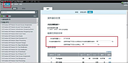 系統管理者透過簡易的操作介面,自行設定日誌保留原則,有效管理儲存空間。首先在介面左上角點選〔儲存〕,在介面中間依序點選以及設定如儲存位置(NFS、CIFS或SAN等等),再來便是設定日誌收集資料達多少儲存空間百分比後,進行資料刪除及停止事件收集等,以確保系統儲存空間不會因為空間不足而造成系統無法運作。