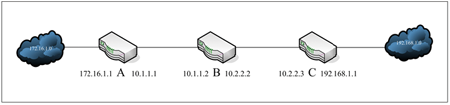 以下面的網路架構圖為例來做說明。圖中有A、B和C三台路由器,以及四段網路區段,分別是172.16.1.0/24、10.1.1.0/24,10.2.2.0/24、192.168.1.0/24。