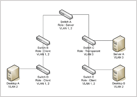 假設要在Switch C上面新增一個VLAN 3,由於Switch C是Transparent的角色,所以當然可以在這台設備上新增、修改及移除VLAN設定值,但是Transparent角色的交換器設備是無法主動發送自己的VLAN設定值,而只會轉發而已,所以由Switch C設備上所建立的VLAN 3,只有Switch C自己才知道。