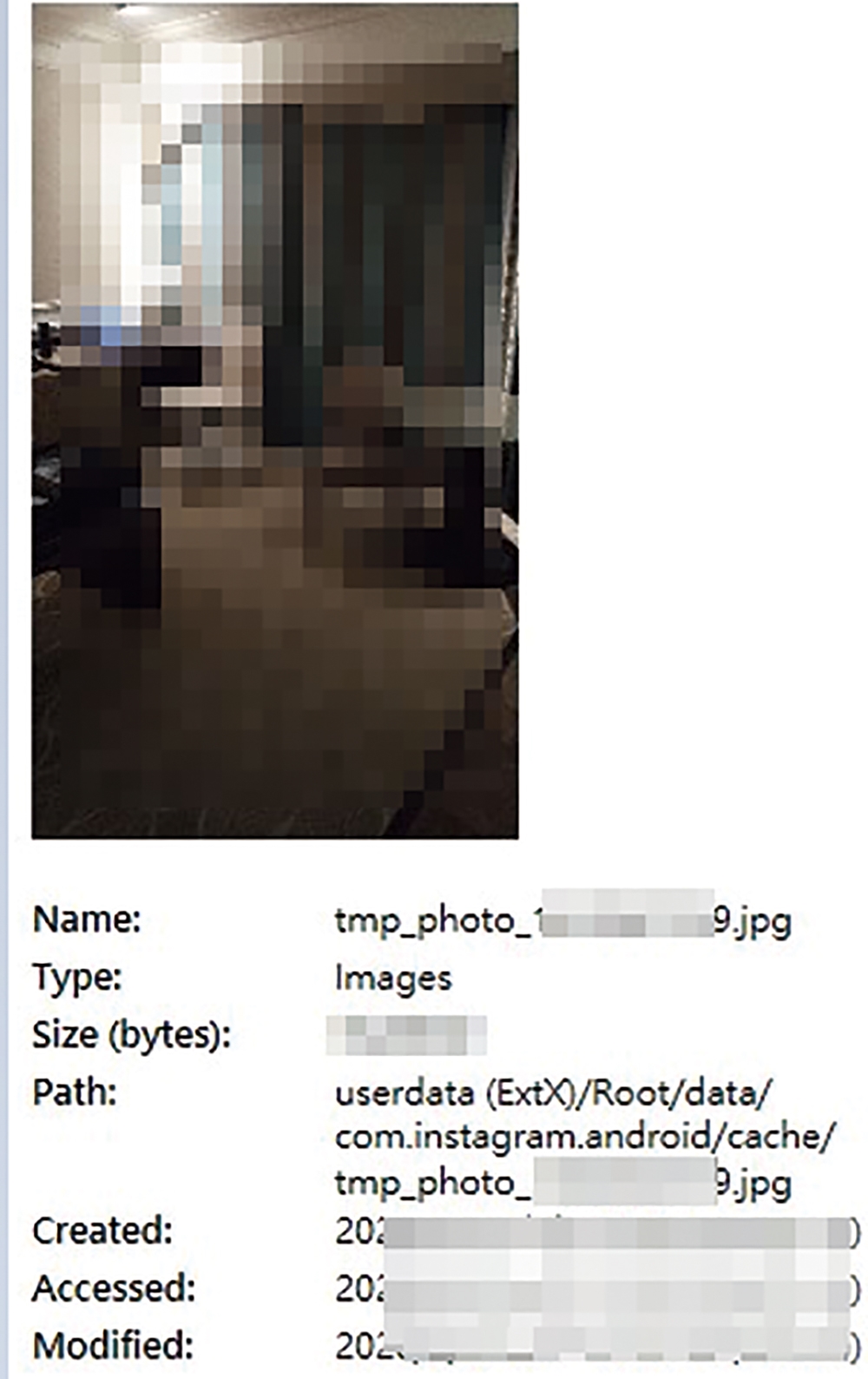 愈是受到社會矚目的案件,破案壓力便愈是沈重,S女遺留在現場的手機已火速送達實驗室。鑑識人員採用專業手機鑑識工具進行提取,由於S女的手機搭載的是MTK晶片,如此一來便有機會化不可能為可能,利用提權的手法達成暫時取得裝置最高權限的效果,儘管手機遭到嚴重程度的滅證,鑑識人員仍在尚存的跡證中找到了一些蛛絲馬跡,那就是IG的暫存檔,如圖1所示。