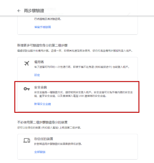 登入Google之後,在設定選項中,接著選擇使用安全金鑰USB Token,如圖12~13所示。