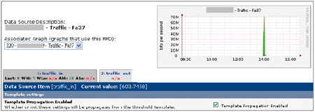 Template Propagation Enabled欄位內可以點選是否繼承之前設定的Threshold Template設定。如果不勾選,可以自行設定其門檻值。換而言之,如果想要自行針對某些Graph設定其門檻值,就無須勾選此選項,並自行設定所需值。