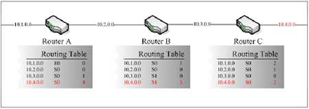 接著,這些路由器設備會把自身的Routing Table與其他鄰近的路由器設備分享,所以路由器B可以從路由器C所送來的資料中學習到透過路由器C可以到達10.4.0.0的網段,因此在路由器B的Routing Table中,10.4.0.0的值為1,因為必須透過一台設備才能到達。