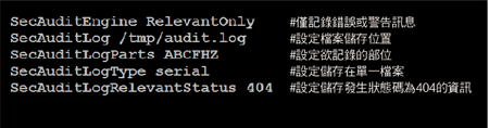 在httpd.conf檔案之中設定相關稽核紀錄選項,來啟動mod_security的Log紀錄功能,如下圖所示為主要記錄HTTP錯誤代碼為404事件(即找不到網頁,亦即網站伺服器上沒有這個檔案),並且將相關的事件儲存在「/tmp/audit.log」檔案內。