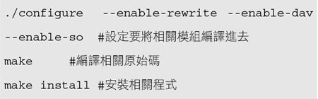 以Apache 2.2.22為例,在編譯時就將webdav編譯進去,由於waf-fle也需要mod_rewrite模組,因此採用原始碼編譯的方式來編譯Apache(其中#為註解):
