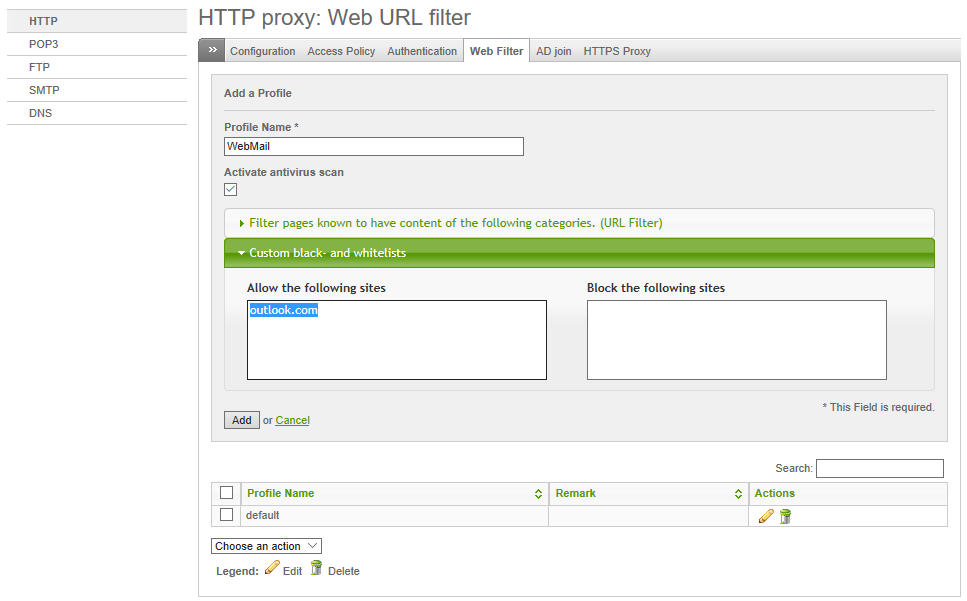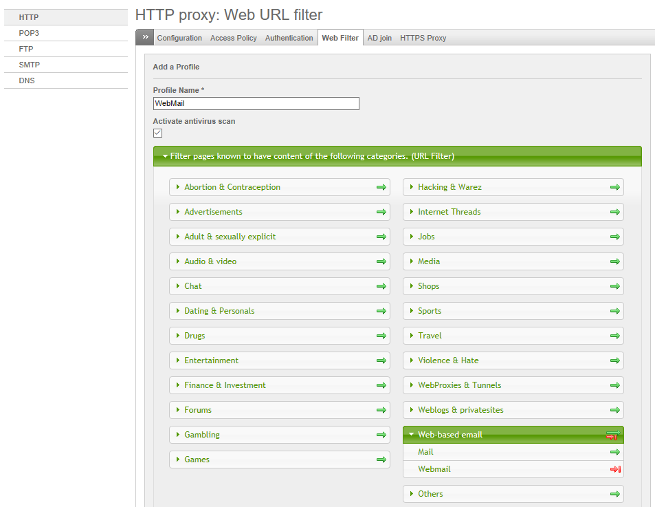 前面所介紹HTTP Proxy中的Access Policy設定,還只是對於LDAP使用者上網控制的基礎設置。現在假設一個情境,也就是讓某位使用者雖然可以瀏覽Internet網站,但卻無法開啟任何的Web Mail網站,像是Google Mail、Yahoo Mail、Outlook.com等等,該怎麼做呢?這時候就得善用Web Filter功能。