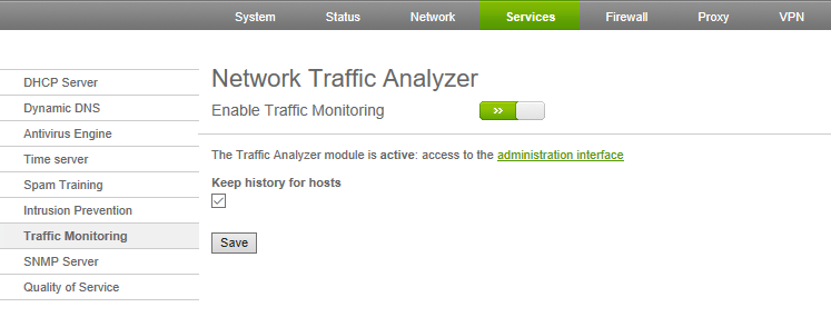 在網路流量分析上,先到「Services」頁面中,如圖15所示啟用Traffic Analyzer服務,並且建議勾選「Keep history for hosts」設定,記得按下〔Save〕按鈕。緊接著,就可以點選「administration interface」超連結。