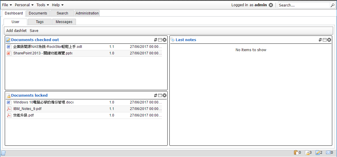 無論是針對文件管理中的鎖定還是取出的操作,對用戶而言,都可以在登入時的「Dashboard」頁面中,如圖17所示,查看到目前正處於這些狀態的文件清單。另外,也可以在〔Tags〕與〔Messages〕頁籤中,檢視到不同分類的文件清單。