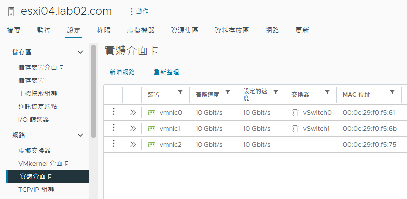 ‧為主要vCenter Server Appliance所在的ESXi主機,以及準備用來運行被動節點、見證節點的ESXI主機皆安裝好一張專屬網卡,以作為vCenter HA連接網路的使用。