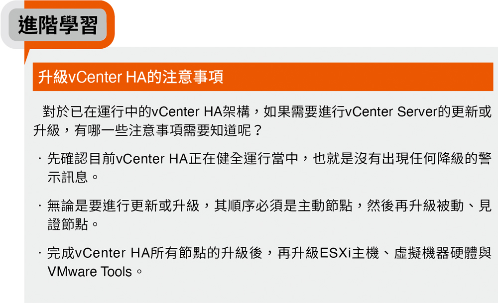 在vCenter HA正常運行的狀態下,主動節點與被動節點之間的資料庫以及組態設定檔案將進行同步與複寫,並且會在主動節點發生故障時自動進行伺服器角色的交換,也就是讓被動節點的vCenter Server開始進行相關服務的啟動,然後再次恢復上線狀態。在容錯執行的過程中,管理員會發現vSphere Client網站暫時無法連線使用,直到vCenter Server的相關必要服務啟動完成為止。
