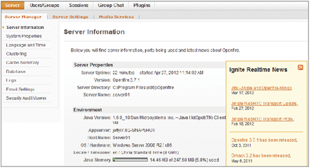 在這個頁面中,可以查閱到Openfire的相關系統資訊,例如版本、安裝路徑、主機名稱、使用的Java版本、作業系統版本。