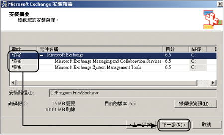 隨後來到「Microsoft Exchange」安裝精靈的「安裝摘要」頁面內,如圖33所示將三個元件項目的「動作」皆設定為「移除」,接著按下〔下一步〕按鈕即可完成移除。完成移除並重新開機後,若有需要,也可以考慮將這部伺服器退出網域做其他用途。