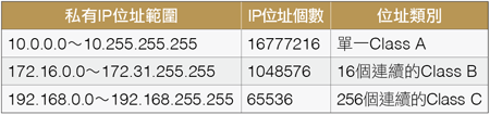 表1 私有IP位址所涵蓋的IP範圍