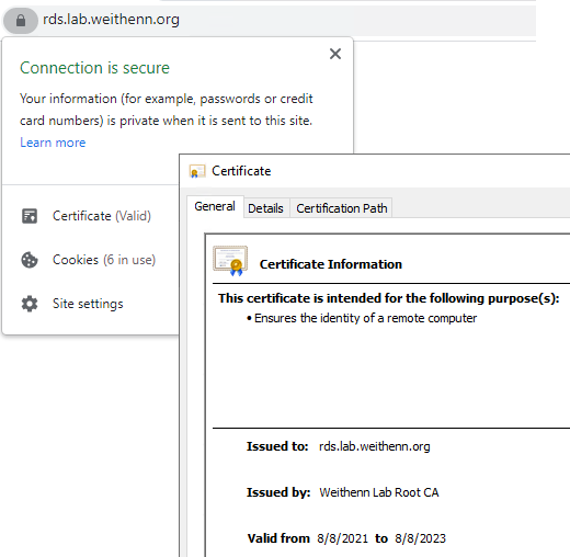 同樣地,再次透過GPO群組原則,將「rds.lab.weithenn.org」憑證推送至網域環境中的所有成員伺服器,再次於客戶端的主機瀏覽RDWeb入口網站伺服器時,便會發現網址列從原本的「Not Secure」轉變為綠色鎖頭,並且為「Connection is secure」狀態,查看憑證資訊,即可看到該憑證是由Root CA簽發給RDS主機,如圖18所示,並且有效期間為2年。