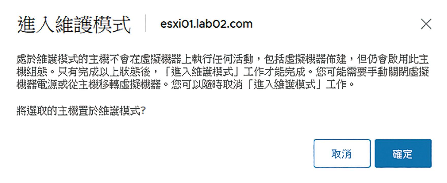 成功完成虛擬機器的移轉後,在ESXi關機之前先執行「動作」選單中的【維護模式】→【進入維護模式】。執行之後,將出現如圖5所示的提示訊息,按下〔確定〕按鈕,等到完成升級後再來結束維護模式即可。