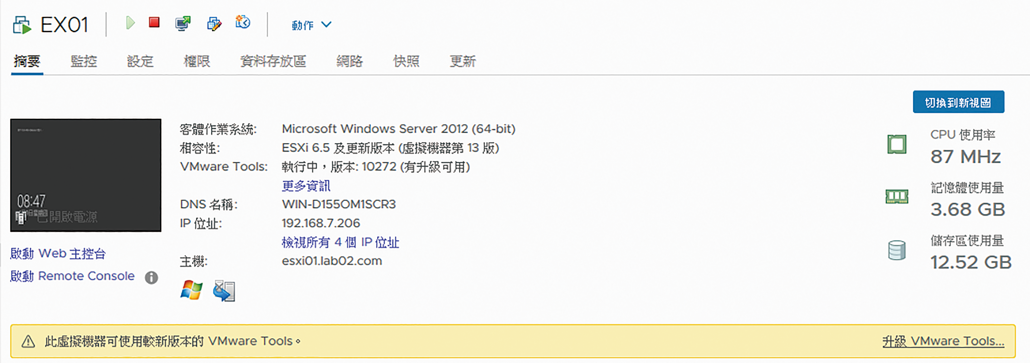如圖20所示,當完成ESXi主機的升級後,就可以發現在此主機上運行的虛擬機器,出現了「此虛擬機器可使用較新版本的VMware Tools」訊息,若要立即進行升級任務可以點選「升級VMware Tools」超連結。