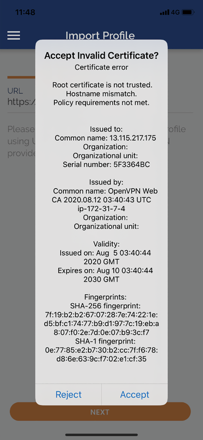 先在App Store搜尋並安裝OpenVPN Connect,下載安裝完成後將之開啟。如圖31所示,先在URL部分輸入「https://13.115.217.175(VPN Server的Public IP)」,然後點選「NEXT」,開始在手機上新增一筆Profile(設定檔)。